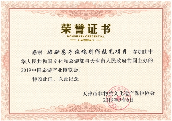 2019年9月,参加2019中国旅游产业博览会,骆驼房子烧鸡制作技艺获得荣誉证书。